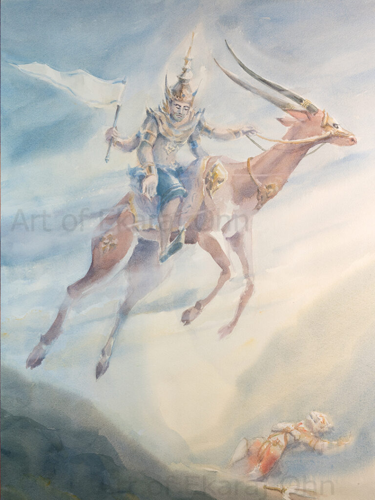 Vayu or Pra PhaiPhra Phai is the God of Wind and Air, considered one of the five main elements of nature. His duty is to provide wind and air to all living things, representing the vital energy necessary for life (known as Prana or the breath of life). He has the power of destruction through violent storms, while also being able to provide a gentle breath. He is often depicted as a dignified male figure, wearing a crown and riding a deer or antelope as his vehicle. In the Ramakien, Phra Phai is the biological father of Hanuman, which grants Hanuman immense strength and power like the wind.