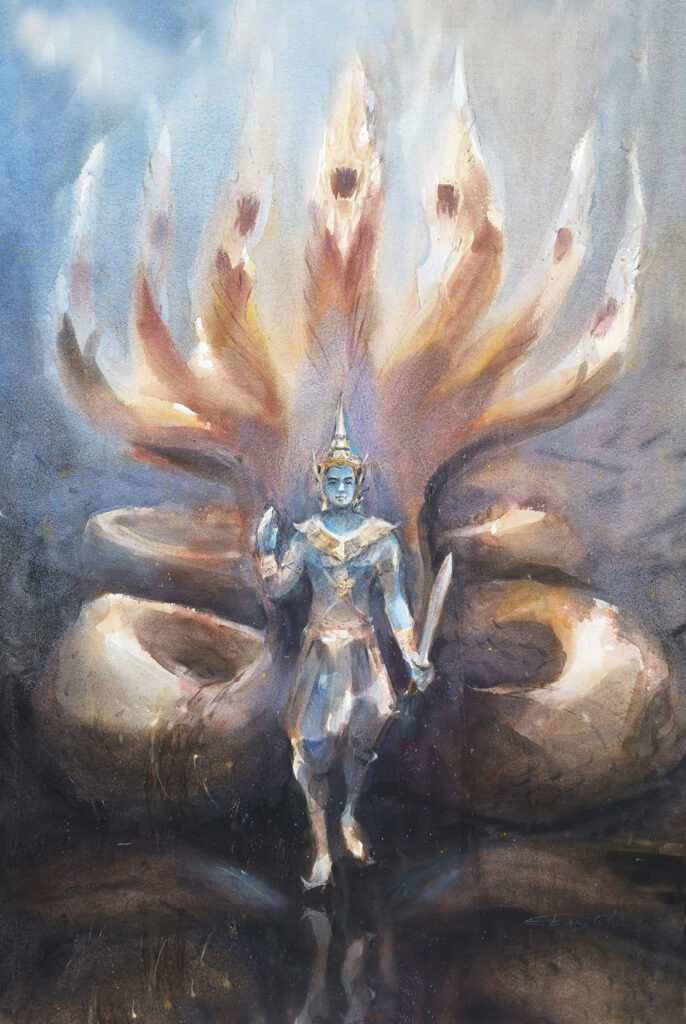VarunaPhra Varuna is the God of Rain, Water, and all the Oceans. His duty is to grant moisture and create abundance on Earth. In the early Indian Rigveda, Varuna’s role was far greater than the current God of Water, as he was considered the deity who controlled the cosmic order (Ṛta), and the protector of truth and justice, punishing those who broke vows or committed sins. Varuna is typically depicted with a white or light blue body (reflecting the color of water), adorned with beautiful gold ornaments, and rides a Nāga (serpent deity) or sometimes a Makara (a mythical sea creature) as his vehicle.