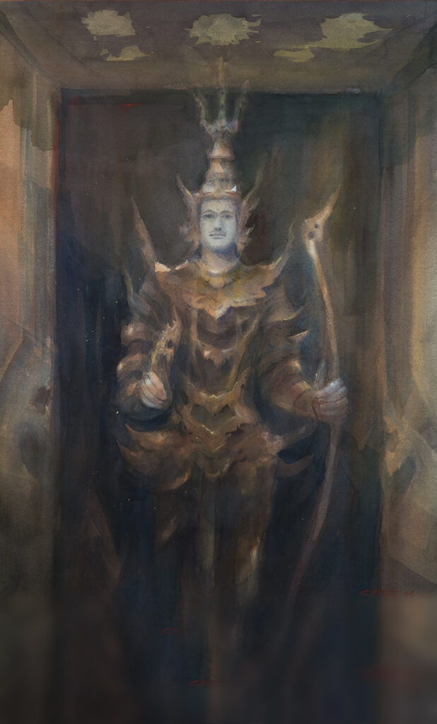 VirūpākshaThao Virūpāksha is one of the Four Heavenly Kings (Chatur Loka Bala). He is the sovereign who governs the West (the Thai text contains an error stating East, but the traditional direction is West). His duty is to supervise and govern all Nāga (serpent deities). He is the chief of the Nāgas and all reptiles residing in the land, rivers, and oceans, governing the four main Nāga clans: the golden, green, rainbow-hued, and black. Thao Virūpāksha has a golden or pale-white complexion and eyes that are a pale blueish-white.