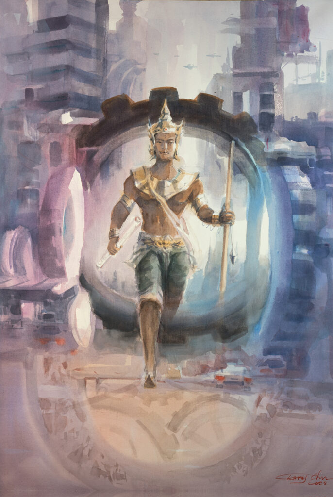 VisvakarmanPhra Visvakarman is the God of Architecture and Engineering or the Great Divine Architect of Heaven. He is the designer and builder of the celestial mansions, palaces, and various facilities for the Devas in heaven. Hindu legends state that he created several important cities, such as Lanka and Dvaraka (Krishna’s city), and also fabricated weapons and ornaments for the deities. In Thailand, Visvakarman is regarded as the “Khrū” (Master) or “Guru Deva” of all branches of craftsmanship, including construction workers, mechanical engineers, architects, and artists. The English word “Engineering” was officially translated into Thai as “Witsawakammasāt” , which is directly derived from his divine name.