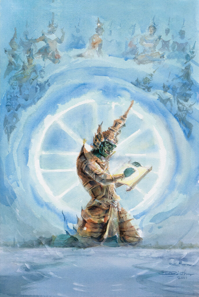 When his warnings failed, Vibhishana chose to leave Lanka and pledged his loyal allegiance to Phra Ram (Lord Rama). Vibhishana’s knowledge of astrology and prophecy helped Phra Ram win the battle of Lanka with distinction.