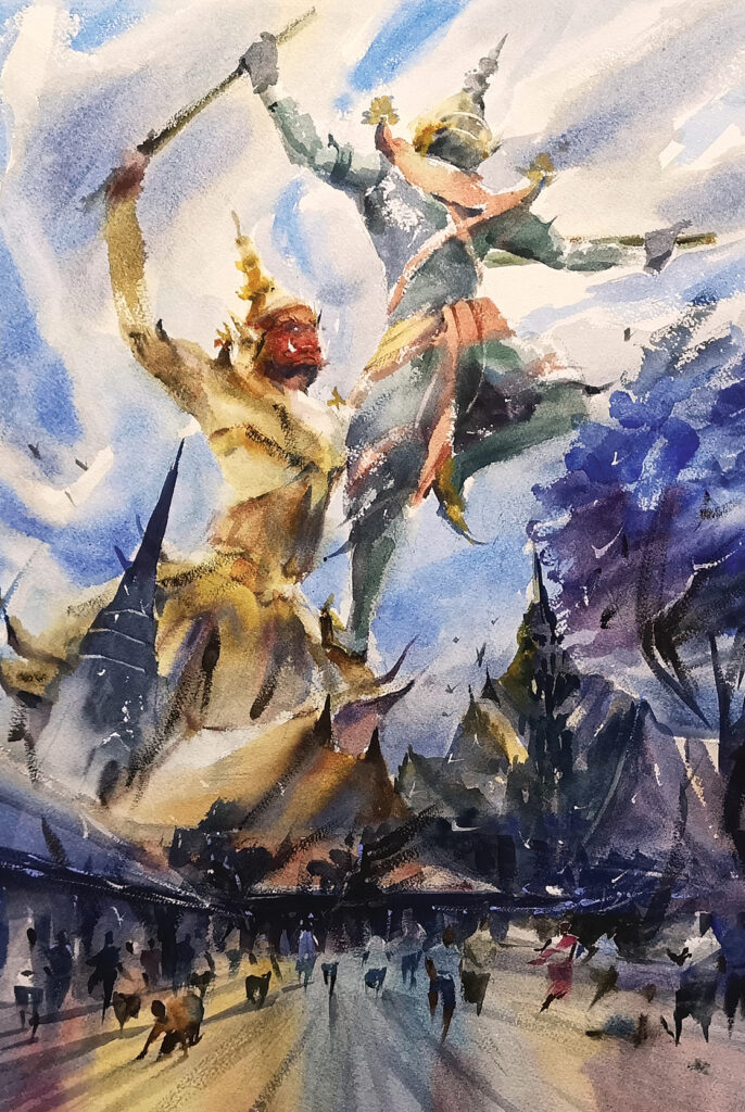 Thotsakan (Ravana) was originally the son of Thao Lastian (Vishrava), but he did not yet possess the authority to rule over all the demon worlds. Therefore, he set his heart on seizing the kingdom of Thao Kuvera (Kubera), who was both his half-brother and the lord of all treasures.