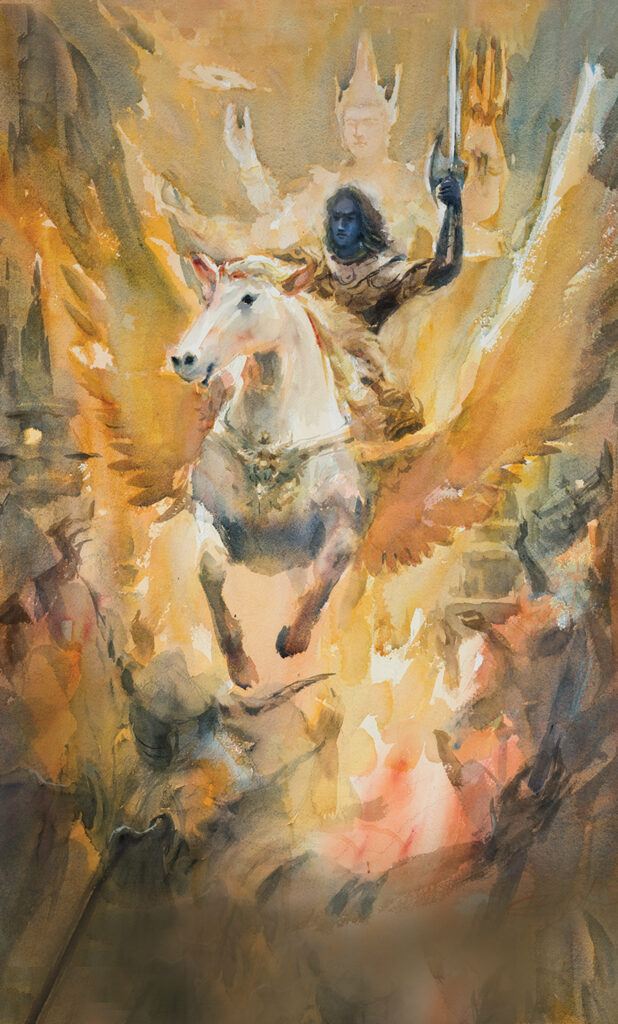 KalkiKalki is the man who rides a white horse, the tenth avatar of Lord Narayana (Vishnu), who will appear at the end of the Kaliyuga (Age of Vice) to eliminate unrighteousness, restore virtue, and usher in the new era, the Satya Yuga (Age of Purity and Truth). His divine weapon is a magical sword, which is inherited from the seventh avatar, Parashurama. In this image, the luminous sword is seen extending from the handle of Parashurama’s axe, symbolizing the power transferred from the past avatar to the one who closes the Kali Yuga.